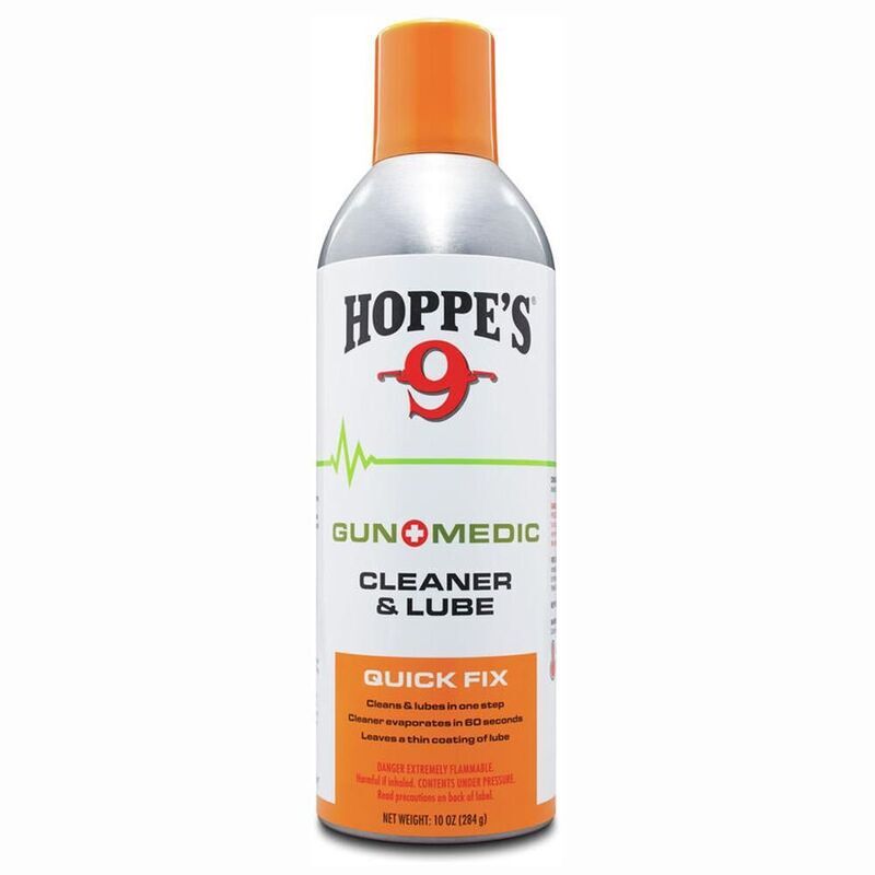 HOPPE’S GUN MEDIC CLEANER & LUBE - QUICK FIX The unrivaled Gun Medic “All-in-Oneformula cleans the actions of firearms and leaves behind a thin layer of high performance lubrication, protecting against the most punishing corrosion. ?? •Great for a quick clean when you don’t have time for the deep clean •Cleanses and lubricates in one step •Cleanser evaporates in 60 seconds ?? •Leaves an extremely thin layer of lube •Lubricant utilizes the same technology used in jet propulsion engines •Cold/Heat resistant -65°F to 500°F •Bio-Based formula